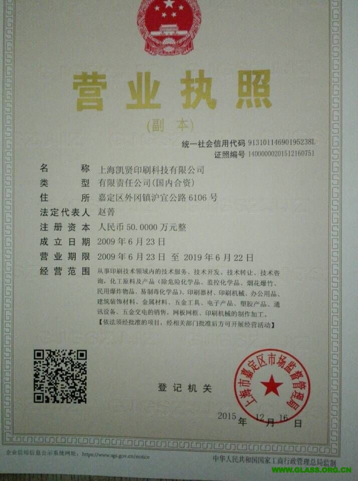 上海凱賢印刷科技有限公司 營業許可證、組織機構代碼證、稅務登記證三證合一。