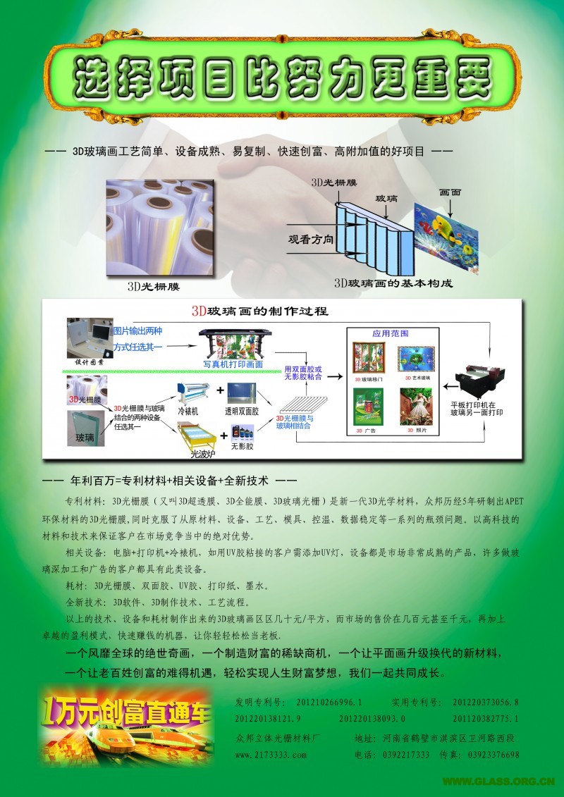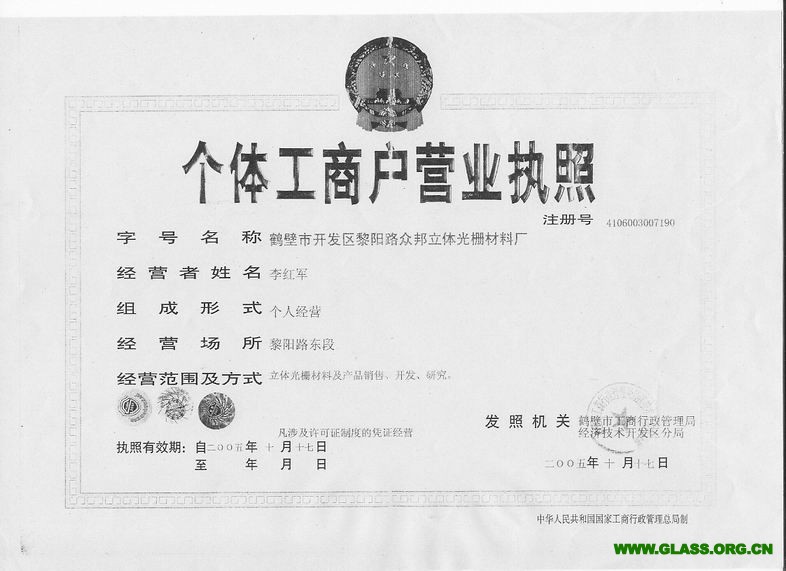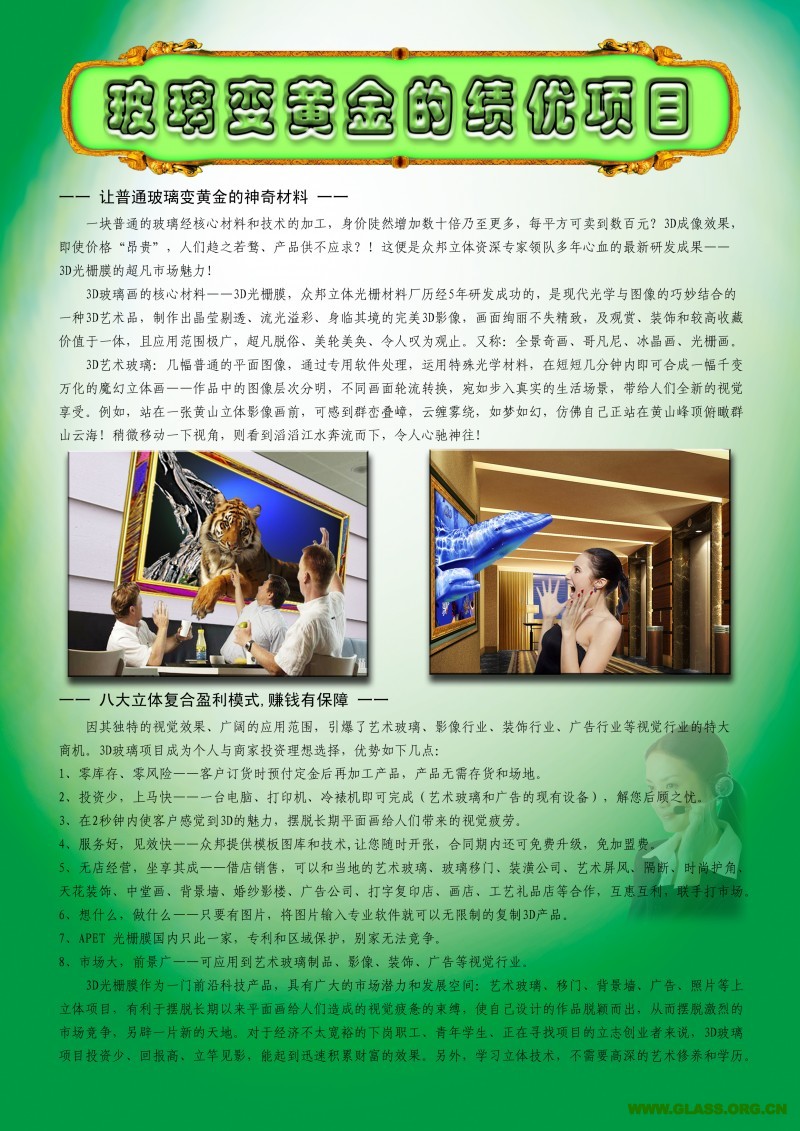 證書介紹 H我廠經過多年的發展,以及研究人員的不斷努力,玻璃移門光柵膜經歷了兩年的艱難時程以及多次攻關,現已問世,該材料的問世得到業內人士的高度評價,此材料的設備和模具由我廠研發部自主研發,技術研發及產品性能上處于行內領先地位,玻璃移門光柵目前是行內唯一可以制作大幅玻璃立體產品的材料,該材料采用APET原料制作,表面光澤,透明度高,數據穩定,聚集準確,便于運輸,易裁切,費品率低,三維立體空間感強,畫面清晰不暈眼,成本低,適用泛圍比較廣,可廣泛應用于多個行業,如:立體移門,大幅立體廣告,立體婚紗照,立體裝飾畫等。立體玻璃移門專用光柵特別適用于高檔立體玻璃移門、立體客廳門,三維立體陽臺門,3D立體臥室門,立體書房門到立體衣柜門、立體櫥柜門以及室內立體藝術裝飾畫、酒吧KTV立體藝術墻幕、專賣店商業3D立體廣告墻等的立體光柵制品。立體移門具有巨大的市場潛力和發展空間,隨后我們也會開發玻璃移門專用的變畫光柵材料 20線 15線 10線,