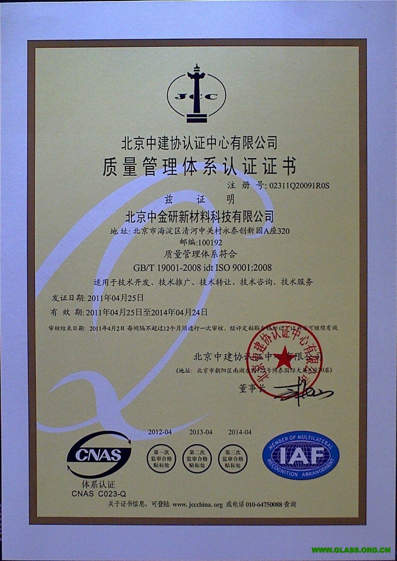 北京中金研,企業通過ISO9001:2008質量體系及ISO14001:2004環境管理體系認證