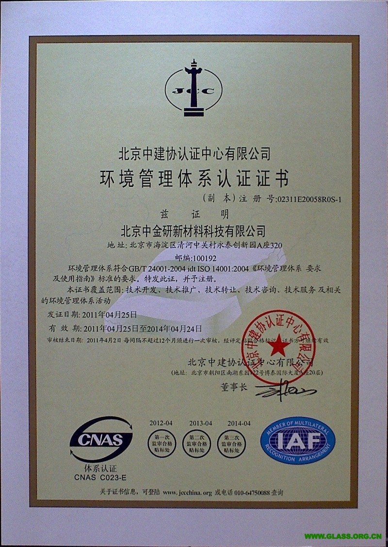 北京中金研新材料科技有限公司通過ISO14001:2004環境管理體系認證