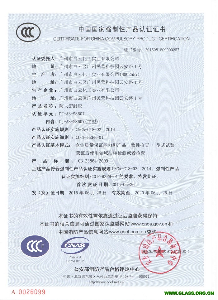 早在2011年,白云化工DJ-A3-SS607防火密封膠就經公安部消防產品合格評定中心的工廠審查、型式檢驗及技術評定,符合消防類產品認證實施規則CCCF-XSRK-009:2011的要求,獲消防產品型式認可證書。成為行業內第一款通過公安部消防產品合格評定中心消防產品型式認可的產品。隨著國家對產品安全性能的要求更加嚴格,公安部消防產品合格評定中心為了更好地維護消費者和委托人的合法權益,開展了消防產品的強制性產品認證工作。強制性產品認證與產品型式認可相比較,更加注重對公司的經營管理水平、生產能力、質保體系等方面的認定。
