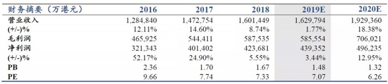 公司19H1實現收入74.5億港元,同減3.8%,歸母凈利21.25億港元,同增5.8%,每股派息25港仙,對應年化股息率超6%,業績符合預期(穩定性遠超玻璃同業公司)。預計公司2019-20年歸母凈利43.9、49.6億港元,分別同增3.4%、13%,對應19年PE約7X,目標價11.5港元。