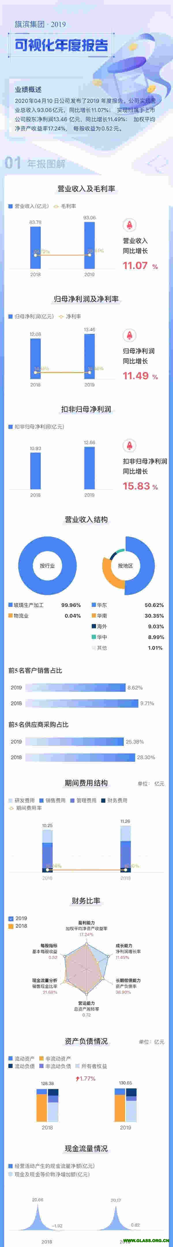 2020年4月10日,旗濱集團對外發布2019年年度報告。年報從生產經營、產業發展、財務狀況、資本市場、社會責任等方面進行披露說明,全面真實報告旗濱集團2019年年度發展的多彩畫卷。