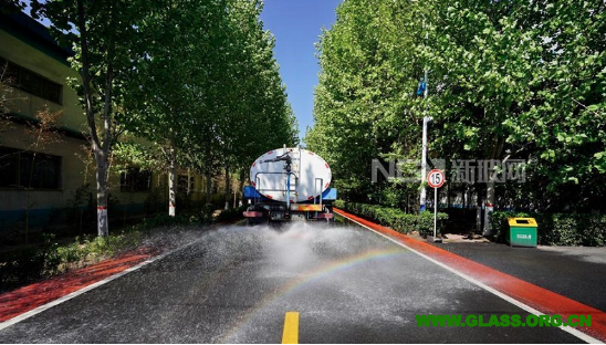 4月23日,灑水車在位于河北省沙河市的河北鑫利玻璃有限公司廠區(qū)內(nèi)灑水防塵。 2019年起,有“中國(guó)玻璃城”美譽(yù)的河北沙河市啟動(dòng)了“煙羽消白”工程,先后投入20億元對(duì)在產(chǎn)玻璃生產(chǎn)線實(shí)施超低排放改造,并結(jié)合提升廠區(qū)環(huán)境、優(yōu)化產(chǎn)能等措施,削減粉塵、二氧化硫、氮氧化物等污染物排放,推進(jìn)大氣污染治理。
