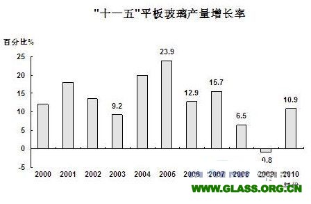 全國玻璃行業在“十一五”期間受我國的房地產建設情況而波動。2005年全國平板玻璃產量為4.02億重量箱,至2010年全國平板玻璃產量達6.3億重量箱,同比增長10.9%,效益更是創歷史最好年份,全年銷售收入預計為690億元,同比增長32.8%,利潤超73億元,同比增長13%。平板玻璃產量“十一五”平均年增長11.2%,整個“十一五”產量增長了56%。(見圖4)