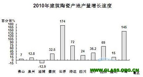 我國的陶瓷行業在“十一五”期間不斷推陳出新,產量也大幅度提高。2005年建筑陶瓷產量為35億平方米,衛生陶瓷產量8000億件,五年后的2010年,建筑陶瓷產量為78.09億平方米,同比增長19.6%,銷售收入預計為2500億元,同比增長30%,利潤將達150億元,同比增長31.5%。衛生陶瓷產量為1.74億件,銷售收入預計330億元,利潤將達27.5億元?!笆晃濉逼陂g,建筑陶瓷產量增長了125.4%,衛生陶瓷產量增長了117.5%。從2010年看,陶瓷產量最大省仍在廣東,其次是福建,以建筑陶瓷為例,廣東已占全國總量的四分之一(見圖6),產量達到近20億平方米。