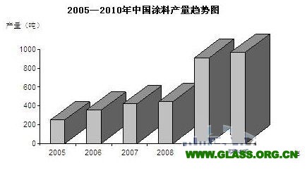2010年我國涂料產量為966.6萬噸,同比上升22.8%,其中建筑涂料為351.9萬噸,同比上升23.7%,繼2009年后又迎來了一個較大的發展(見圖7)。
