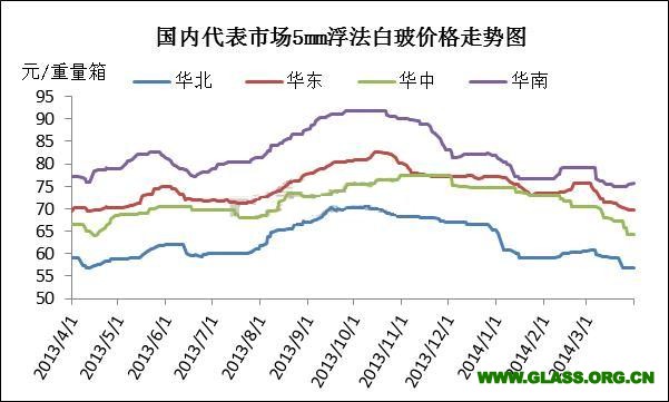 第一季度國(guó)內(nèi)浮法玻璃市場(chǎng)低迷依舊,各地市場(chǎng)普遍下行,目前價(jià)格已普遍低于春節(jié)期間促銷價(jià)格。2014年開春市場(chǎng)恢復(fù)一直較緩慢,業(yè)者多不看好第一季度行情走勢(shì),但多地區(qū)價(jià)格跌至成本線下仍是大家始料未及的。目前生產(chǎn)企業(yè)庫(kù)存壓力仍較大,走貨情況一般,業(yè)內(nèi)人士多認(rèn)為4月份若需求能有較好恢復(fù),市場(chǎng)將會(huì)回暖,5-6月份價(jià)格亦不會(huì)太低。但如果4月份終端需求恢復(fù)情況不佳,生產(chǎn)企業(yè)價(jià)格難以提漲,那么5-6月份將要到來的梅雨季節(jié)又將為市場(chǎng)上行帶來一大阻礙。就目前國(guó)內(nèi)形勢(shì)來看,產(chǎn)能過剩依舊較嚴(yán)重,1、2月份房地產(chǎn)數(shù)據(jù)亦是讓人堪憂,因此卓創(chuàng)資訊預(yù)計(jì),短期市場(chǎng)或呈現(xiàn)緩慢轉(zhuǎn)暖態(tài)勢(shì),但價(jià)格上行空間不大,長(zhǎng)線看來市場(chǎng)或以窄幅盤整為主,難有較大波動(dòng)。