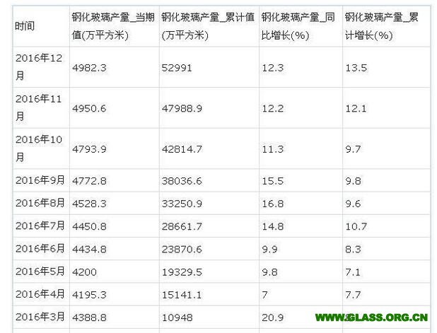 2016年12月我國鋼化玻璃當(dāng)月產(chǎn)量4982。3萬平方米,全年累計產(chǎn)量52991萬平方米,同比增長12。3%,累計增長13。5%。