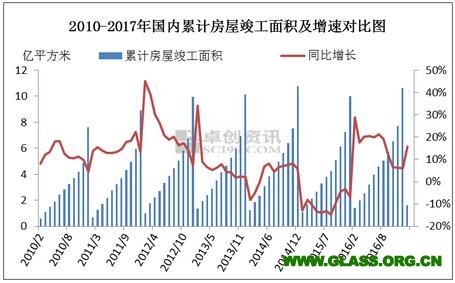 在浮法玻璃下游領域中,房地產市場需求占比達75%以上,其次是汽車、家電、出口。各項數據顯示,2016年房地產市場整體銷售情況較2015年有明顯好轉,國家統計局發布的數據顯示,2016年全國房地產開發投資102581億元,同比增長6.90%,增速比上年同期增長6.87%。研究房地產的主要指標包括房地產開發投資完成額、房屋新開工面積、房屋竣工面積、商品房銷售面積。其中國內房地產的竣工面積對玻璃需求量具有重要影響,房地產行業在建設、裝修環節大范圍使用玻璃,可直接影響到玻璃企業的走貨和銷售情況。通過前十年的數據分析也可以發現,房地產竣工面積及銷售面積與玻璃需求具有極高的正相關性。