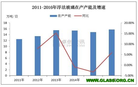 2011年以前,玻璃行業充分享受到房地產行業高速發展的紅利,2004年、2007年、2010年、2013年是玻璃行業的繁盛時期,伴隨而來的也是新增產能的大量投放。2014年國內浮法玻璃在產產能處于較高水平,最高同比漲幅可達19%左右。產能集中投放使2015年國內浮法玻璃市場持續低迷、企業虧損嚴重,加之環保形勢嚴峻,眾多生產線放水冷修,部分企業被迫破產,使得全年在產產能持續負增長,前期產能集中投放帶來的壓力得到一定釋放。2016年隨著下游需求好轉,浮法玻璃價格上漲,企業利潤得到巨大提升。但隨著市場行情以及企業盈利情況好轉,下半年開始,國內浮法玻璃整體產能釋放率開始呈現上行態勢,新的產能高峰面臨再度開啟。