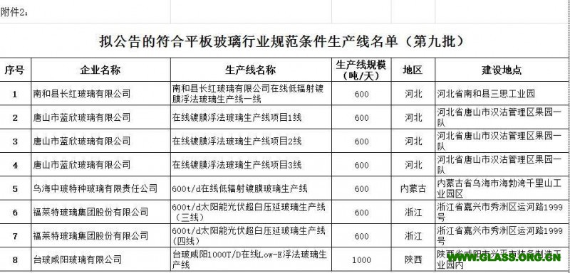 此次共5家企業8條生產線進入擬公告的符合平板玻璃行業規范生產條件生產線名單(第九批),具體名單如下: