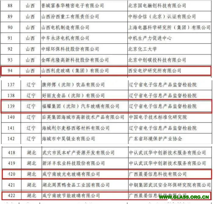 其中,擬入選的玻璃企業有以下七家:山西利虎玻璃(集團)有限公司、福耀集團(沈陽)汽車玻璃有限公司、咸寧南玻光電玻璃有限公司、咸寧南玻節能玻璃有限公司、臺玻咸陽玻璃有限公司、艾杰旭顯示玻璃(深圳)有限公司、信義汽車玻璃(深圳)有限公司。