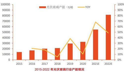 歷史上光伏玻璃一度被納入平板玻璃產能置換范圍,2020年下半年,擴張受限的產能無法應對高景氣度下的爆發性需求,光伏玻璃出現供需失衡,價格飆漲。在多家光伏組件企業的聯合呼吁下,去年12月,工信部發文明確光伏壓延玻璃項目可不制定產能置換方案。受新政策影響,2021年起光伏玻璃擴產增速,預計2021年有明確投產計劃的光伏壓延玻璃產能達到22250t/d,年增長率68.4%。