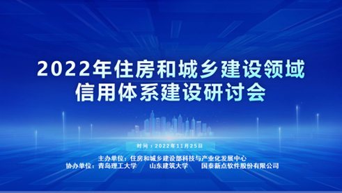 2022年11月25日下午,由住房和城鄉建設部科技與產業化發展中心主辦,青島理工大學、山東建筑大學和國泰新點軟件股份有限公司協辦的“2022年住房和城鄉建設領域信用體系建設研討會”通過在線直播形式順利召開。