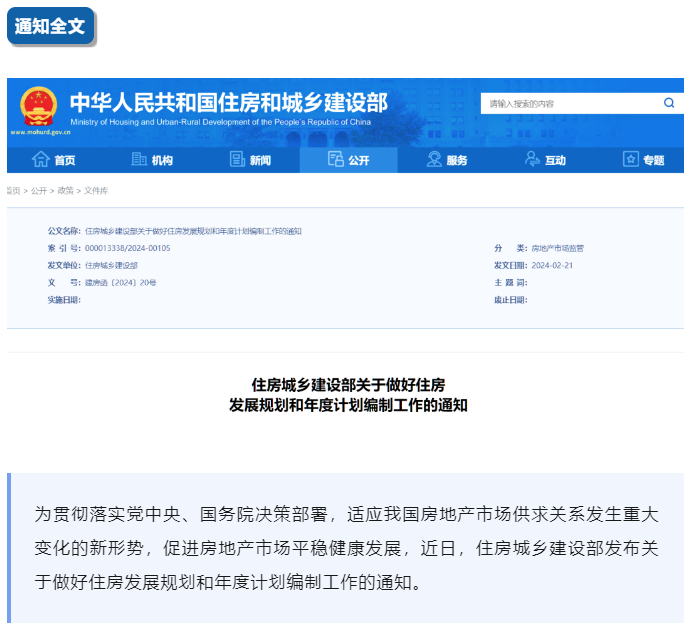 按照要求,住房發展年度計劃要明確年度各類住房及用地供應規模、結構和區位,測算房地產項目合理融資需求。保障性住房要進一步明確供應套數和戶型結構。要將房地產市場平穩健康發展、住房保障輪候時間等納入目標管理。2024年4月30日前、2025年3月31日前,各城市要以適當方式向社會公布當年住房發展年度計劃有關情況。