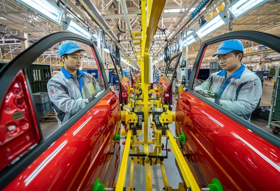 △山西一家新能源汽車生產基地,工人們正在組裝新能源車車門。