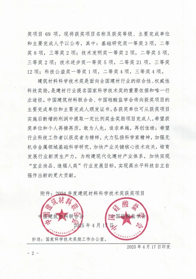 為表彰在推動全國建材行業綠色低碳安全高質量發展中提供重要科技支撐、作出突出貢獻的單位和個人,根據《中華人民共和國科學技術進步法》和《建筑材料科學技術獎管理辦法》的規定,建筑材料科學技術獎獎勵工作辦公室組織近100名以中國建筑材料聯合會專家委員會首席專家和學部委員為主體的行業專家組成評審委員會,對各有關單位提名的2024度建筑材料科學技術獎項目進行了評審,并將評審結果在中國建筑材料聯合會官網及微信公眾號、中國硅酸鹽學會官網等媒體上公示。經中國建筑材料聯合會和中國硅酸鹽學會組成的獎勵工作領導小組審定,決定授予2024年度建筑材料科學技術獎項目69項?,F將獲獎項目名稱及獲獎等級、主要完成單位和主要完成人予以公布,其中:基礎研究獎一等獎3項,二等獎8項,三等獎2項;技術發明獎一等獎2項,二等獎5項,三等獎2項;技術進步獎一等獎5項,二等獎21項,三等獎12項;科技公益獎一等獎1項,二等獎4項,三等獎4項。