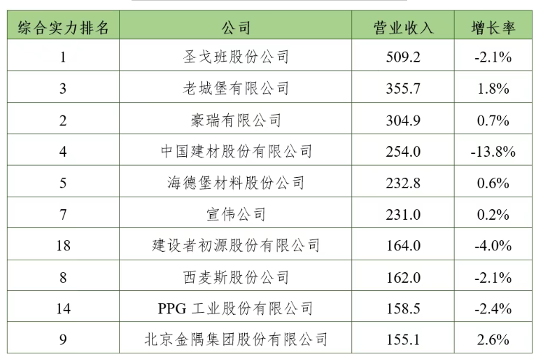 圣戈班股份公司(法國)連續(xù)三年位居綜合實(shí)力第一名,營運(yùn)利潤率和現(xiàn)金流創(chuàng)造新紀(jì)錄,并通過收購業(yè)務(wù),不斷擴(kuò)大在化學(xué)建材領(lǐng)域的份額;豪瑞有限公司(瑞士)穩(wěn)居第二名,流動資產(chǎn)略有下降,其余指標(biāo)均有不同程度的增長;老城堡有限公司(愛爾蘭)營業(yè)利潤繼續(xù)保持增長態(tài)勢,排在第三名;中國建材股份有限公司營業(yè)收入和營業(yè)利潤降低,排在第四名; 海德堡材料股份公司(德國)營業(yè)利潤小幅下降,其余指標(biāo)略有增長,排在第五名。亞薩合萊公司(瑞典)營業(yè)收入和利潤率均達(dá)到了兩位數(shù)的增長,首次躋身前十。