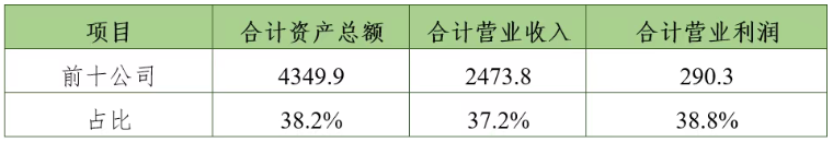 與2024年前十名公司相比,本次前十名公司的合計(jì)資產(chǎn)總額減少1.8%,合計(jì)營業(yè)收入減少5.3%,合計(jì)營業(yè)利潤增加3.0%。前十名公司的合計(jì)資產(chǎn)總額、合計(jì)營業(yè)收入在百家公司總額中的占比分別減少1.5個百分點(diǎn)和0.9個百分點(diǎn),合計(jì)營業(yè)利潤占比則增加2.1個百分點(diǎn)。頭部企業(yè)保持了較強(qiáng)的盈利能力。