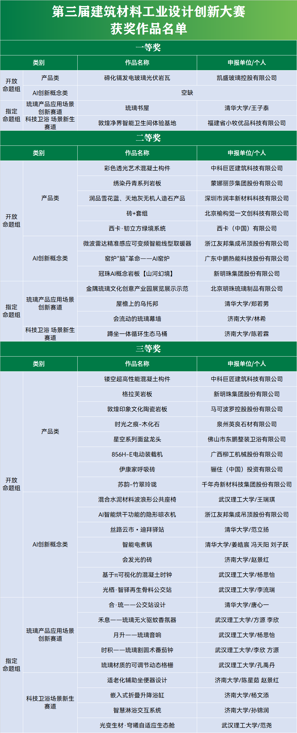 本屆大賽采取自愿申報(bào)的方式,面向行業(yè)和院校廣泛征集,按照大賽管理辦法,經(jīng)大賽評審委員會(huì)評審、網(wǎng)絡(luò)投票,并由大賽工作領(lǐng)導(dǎo)小組審定,現(xiàn)將第三屆建筑材料工業(yè)設(shè)計(jì)創(chuàng)新大賽獲獎(jiǎng)作品名單予以公布。本次大賽共評出獲獎(jiǎng)作品一等獎(jiǎng)3項(xiàng)、二等獎(jiǎng)12項(xiàng)、三等獎(jiǎng)24項(xiàng)。