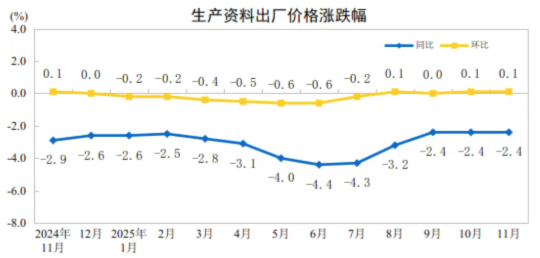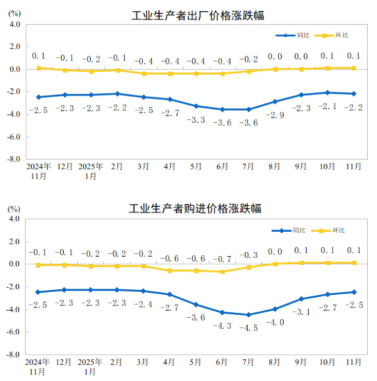 2025年11月份,全國工業(yè)生產(chǎn)者出廠價格同比下降2.2%,工業(yè)生產(chǎn)者購進價格同比下降2.5%;工業(yè)生產(chǎn)者出廠價格和購進價格環(huán)比均上漲0.1%,漲幅均與上月相同。1—11月平均,工業(yè)生產(chǎn)者出廠價格比上年同期下降2.7%,工業(yè)生產(chǎn)者購進價格下降3.1%。