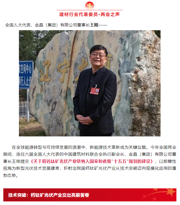 金晶集團是以玻璃、純堿及其延伸產品的開發、生產、加工、經營為主業,專注于太陽能新材料、建筑節能新材料以及交通家電等領域的工業品新材料、生物基產品及原料等主要方向的集團公司。近年來,在王剛的帶領下,金晶集團在鈣鈦礦光伏產業發展中同樣也扮演著重要角色。