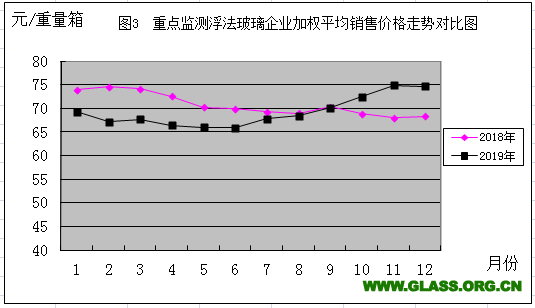 2018年與2019年重點監測浮法玻璃加權平均銷售價格走勢對比圖