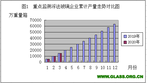 2019年與2020年重點監測浮法玻璃企業累計產量走勢對比圖(2020年3月份)