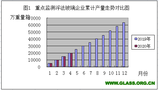 2019年與2020年重點監(jiān)測浮法玻璃企業(yè)累計產(chǎn)量走勢對比圖(2020年4月份)
