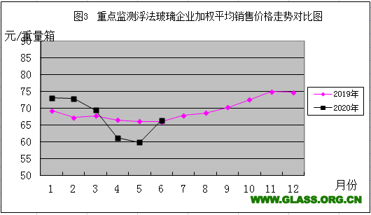 2019年與2020年重點監測浮法玻璃加權平均銷售價格走勢對比圖