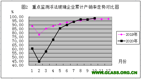 2019年與2020年重點監測浮法玻璃企業累計銷售率走勢對比圖(2020年10月份)