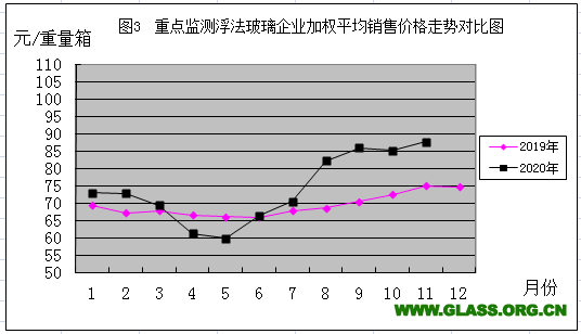 2019年與2020年重點監(jiān)測浮法玻璃加權(quán)平均銷售價格走勢對比圖