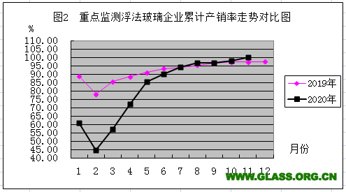 2019年與2020年重點監測浮法玻璃企業累計銷售率走勢對比圖(2020年11月份)