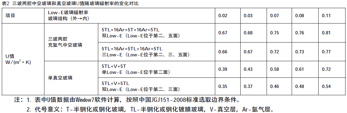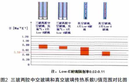 表2和圖2可見,當Low-E玻璃輻射率為0.02-0.11時,三玻兩腔中空玻璃頂級配置(充16mm氬氣,采用三片Low-E玻璃)的傳熱系數U值為0.66-0.77 W/(m2·K)。而真空玻璃則通過基本的配置(采用1片Low-E),U值就可以低至0.39W/(m2·K),使用兩片Low-E的真空玻璃U值可以低至0.35W/(m2·K)。