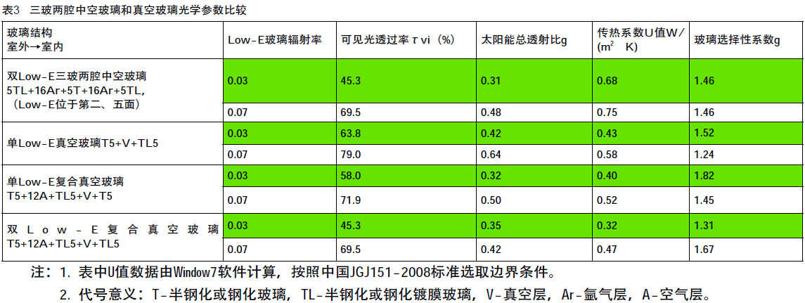 表3可見,三玻兩腔中空玻璃為滿足低U值的要求,一般使用二片或三片Low-E玻璃,這就致使可見光透過率大大降低,嚴重影響了室內的采光,一方面使人感覺壓抑,另一方面也增加了照明能耗。而(復合)真空玻璃只使用一片Low-E玻璃,U值就可以達到被動房要求,同時可見光透過率也高,采光性好。另外,可以在保證整窗U值不變的前提下,減小整窗的窗框面積,增加玻璃面積,使居住環境更加透亮。
