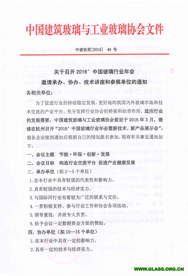 關于召開2016'中國玻璃行業年會邀請承辦、協辦、技術講座和參展單位的通知