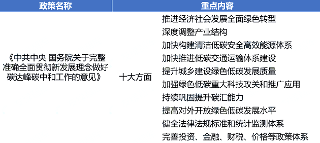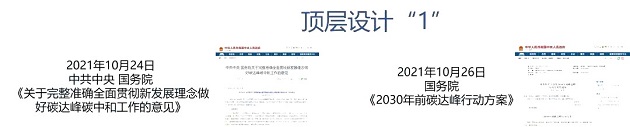 2021年10月24日發布《中共中央 國務院關于完整準確全面貫徹新發展理念做好碳達峰碳中和工作的意見》,作為“1”,是管總管長遠的,在碳達峰碳中和“1+N”政策體系中發揮統領作用;意見與同年10月26日國務院發布的《2030年前碳達峰行動方案》共同構成貫穿碳達峰、碳中和兩個階段的頂層設計。“N”則包括能源、工業、交通運輸、城鄉建設等分領域分行業碳達峰實施方案,以及科技支撐、能源保障、碳匯能力、財政金融價格政策、標準計量體系、督察考核等保障方案。一系列文件將構建起目標明確、分工合理、措施有力、銜接有序的碳達峰碳中和政策體系。