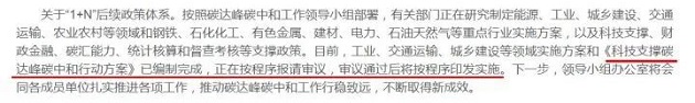 國家發改委在2021年11月份例行新聞發布會中提到《科技支撐碳達峰碳中和行動方案》已編制完成,但目前還未發布。
