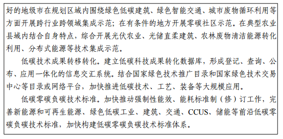 以促進成果轉移轉化為目標,開展一批典型低碳零碳技術應用示范,到 2030 年建成 50 個不同類型重點低碳零碳技術應用示范工程,形成一批先進技術和標準引領的節能降碳技術綜合解決方案。在基礎條件好、有積極意愿的地方,開展多種低碳零碳技術跨行業跨領域耦合優化與綜合集成,開展管理政策協同創新。加強科技成果轉化服務體系建設,結合國家綠色技術推廣目錄和國家綠色技術交易中心等平臺網絡,綜合提升低碳零碳技術成果轉化能力,推動低碳零碳技術轉移轉化。完善低碳零碳技術標準體系,加強前沿低碳零碳技術標準研究與制定,促進低碳零碳技術研發和示范應用。