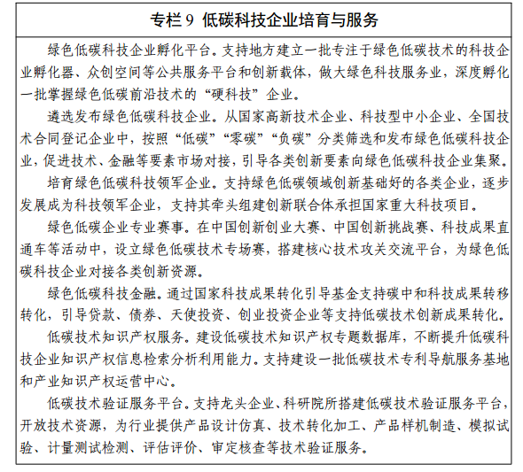 加快完善綠色低碳科技企業孵化服務體系,優化碳達峰碳中和領域創新創業生態。遴選、支持 500 家左右低碳科技創新企業,培育一批低碳科技領軍企業。支持科技企業積極主持參與國家科技計劃項目,加快提升企業低碳技術創新能力。提升低碳技術知識產權服務能力,建立低碳技術驗證服務平臺,為企業開展綠色低碳技術創新提供服務和支撐。依托國家高新區,打造綠色低碳科技企業聚集區,推動綠色低碳產業集群化發展。